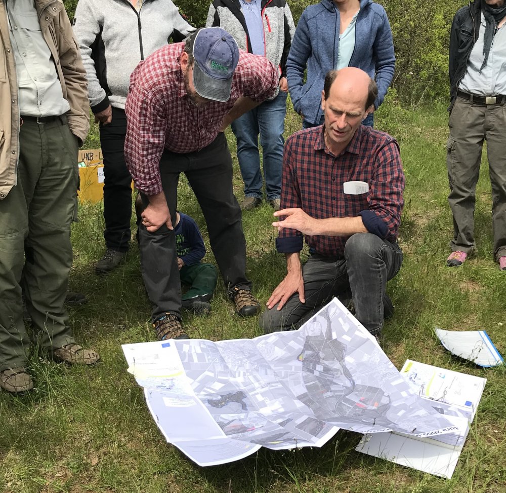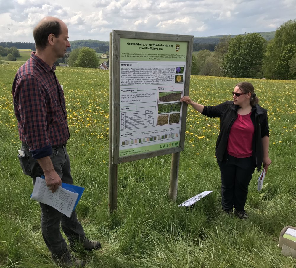 Dr. Kerstin Grant, Grünlandexpertin des LAZBW in Aulendorf, stellte den mehrjährigen Praxisversuch des LAZBW und dessen Ergebnisse vor. Peter Heffner vom LEV erläuterte das Vorgehen bei der Kartierung einer FFH-Mähwiese (siehe Fotos).